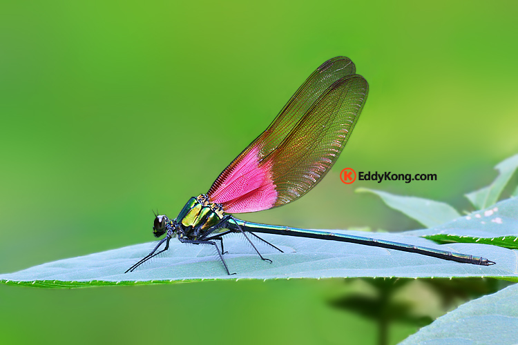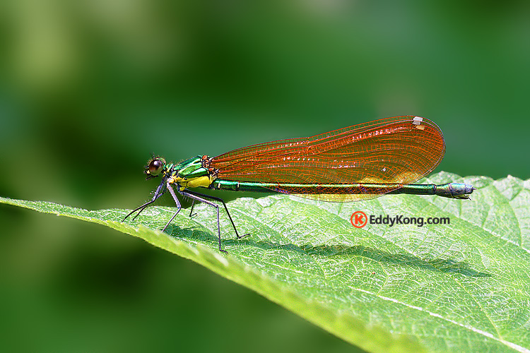 昆虫种名:烟翅绿色蟌 Mnais mneme Ris, 1916   所属类别:均翅亚目 色蟌科Calopterygidae